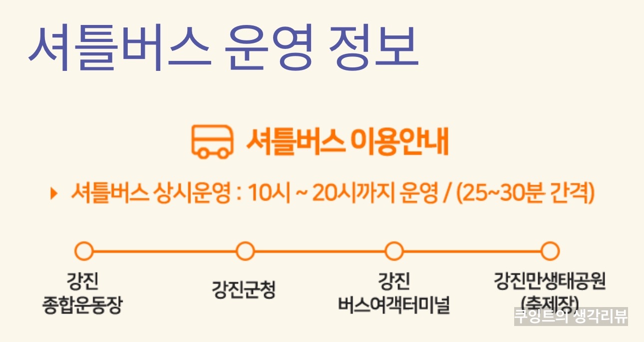강진 종합운동장 / 강진군청 / 강진 버스여객터미널 세 곳에 “갈대축제 셔틀버스 타는 곳” 입간판이 설치돼 어렵지 않게 찾으실 수 있을 거예요!